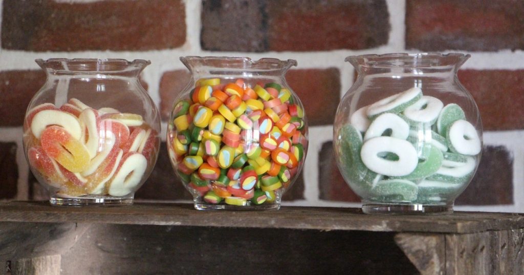 35. Saure Gummitiere, Bonbons, Lakritz im Glas auf dem Regal