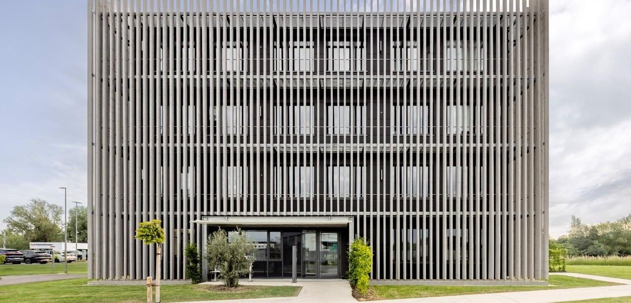 Die markante Fichtenholzlamellenfassade schützt das Donauwörther Bürogebäude wirkungsvoll vor direkter Sonneneinstrahlung und unterstützt passive Kühlstrategien durch Aufheizungsschutz. Im Inneren gewährleisten manuelle AWS?75.SI Fenster, sensorbasierte TipTronic SimplySmart Elemente und das hocheffiziente VentoTherm Twist Modul dezentrale Frischluftversorgung mit Wärmerückgewinnung. KNX-gesteuerte Automationssoftware integriert Photovoltaik, Geothermie und Lüftung. Umfangreiche Sensorik erfasst Klima- und Nutzungsdaten. Ein Forschungslabor vergleicht Komfort und Effizienz aller drei Lüftungssysteme.
